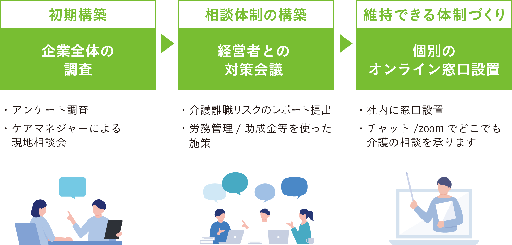 専門の介護離職防止アドバイザーが、貴社の大切な従業員の見えない悩みを、人事担当者様に代わり対応いたします。