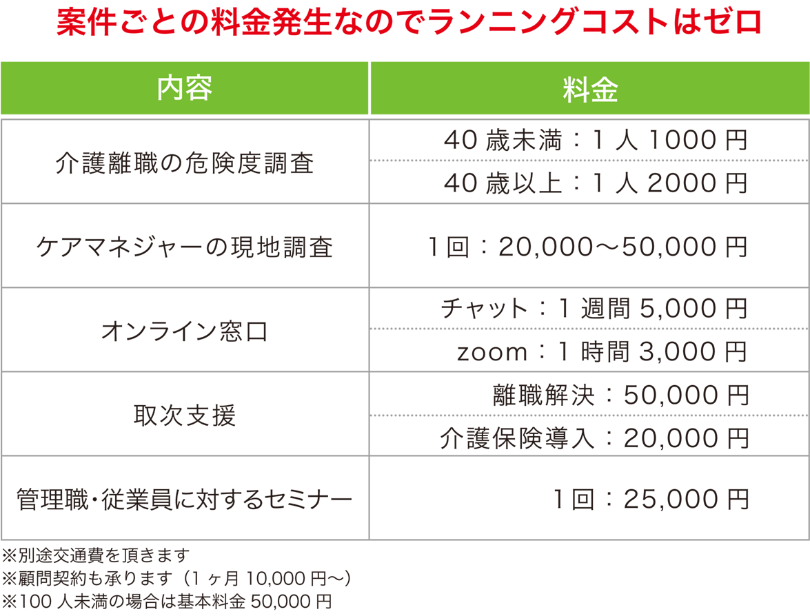 貴社の介護相談窓口としてだけでなく、潜在的な離職予備群を事前に発見する予防、調査サービスとしても、幅広い業種でご利用いただいています。なかなか危機感をもってもらいにくい介護離職を事前に発見し、早い段階で解決できる「両立かいごくん」は高齢者分野の福利厚生サービスとして、素早い課題解決をご提供できます。